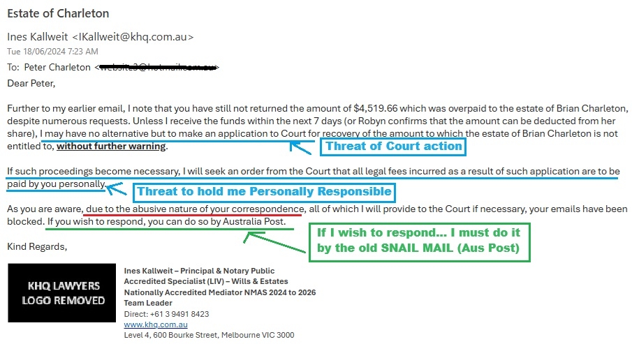 Today l received an email from Ines Kallweit of KHQ LAWYERS (Melbourne). I should point out, KHQ LAWYERS banned me (and my aunt) from sending emails, but seemingly they can send them (emails) to me... Double Standards l say!